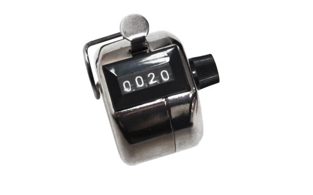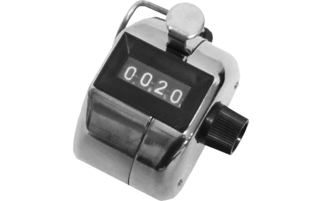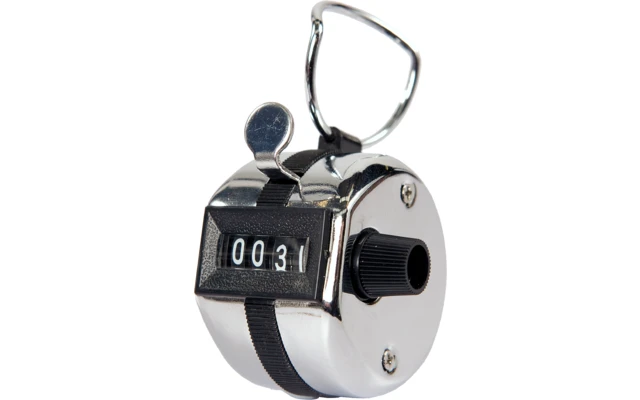 Mechanisches Gerät zum leichten Zählen. Einfach jedes Mal auf das Knöpfchen drücken. Für Sport, Statistik, Naturbeobachtungen, etc. Mit Rückstellknopf. Zählt bis 9999.