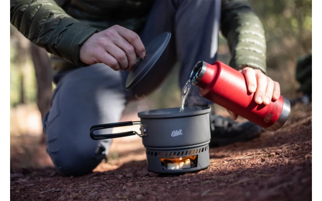 Sternenhimmel, Lagerfeuer und das leise Blubbern des heißen Teewassers – eine Stärkung hat jeder Abenteurer am Ende des Tages verdient. Mit dem 1000 ml Trockenbrennstoffkochset aus extrem leichtem, hartanodisiertem Aluminium macht Reisen Spaß, denn es beschwert das Gepäck mit einem Gewicht von nur etwa 314 g kaum. Anfeuern lässt sich das Kochset mit zwei 14 g oder einer 27 g Esbit Trockenbrennstoff-Tabletten (nicht im Lieferumfang enthalten). Der Deckel kann während des Kochens praktisch am Rand des Topfes aufgehängt werden. Der Stand lässt sich im Inneren des Topfes für den Transport verstauen, sodass das Kochset ein besonders kleines Packmaß hat.