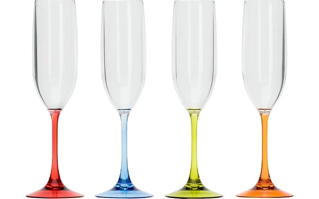 4er Set Sektgläser mit farbigem Stiel. Die transparenten Gläser sind bruchstabil. Sie sind in der Optik täuschend echt zum Glas, weisen eine hohe Festigkeit auf und sind beständig gegnüber Kratzern.