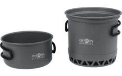 Das sehr leichte Topfset aus hartanodisiertem Aluminium ist mit einem hocheffizienten Wärmetauscher ausgestattet. Der Wärmetauscher spart Zeit beim Kochen und reduziert den Brennstoffverbrauch. Die stabilen Klappgriffe bieten sicheren Halt beim Kochen. Platzsparend verstaubar, erfolgt der Transport im praktischen Netzbeutel.
